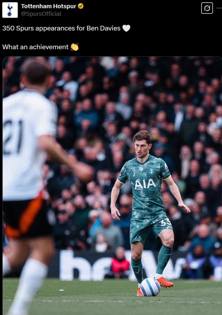本場比賽也是本-戴維斯生涯代表熱刺各項賽事第350次登場,球隊官推也曬照為其紀(jì)念,配文寫道:“多么了不起的成就!”