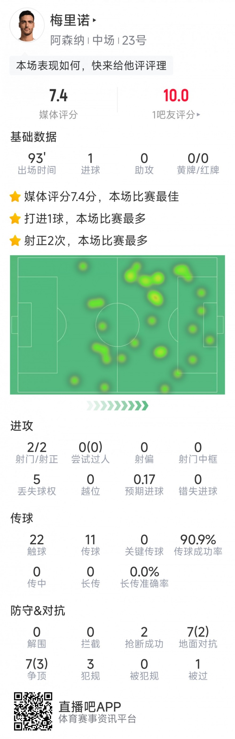 3月16日訊 在本輪英超阿森納1-0擊敗切爾西的比賽中,梅里諾打進(jìn)唯一進(jìn)球。以下為他在本場數(shù)據(jù):