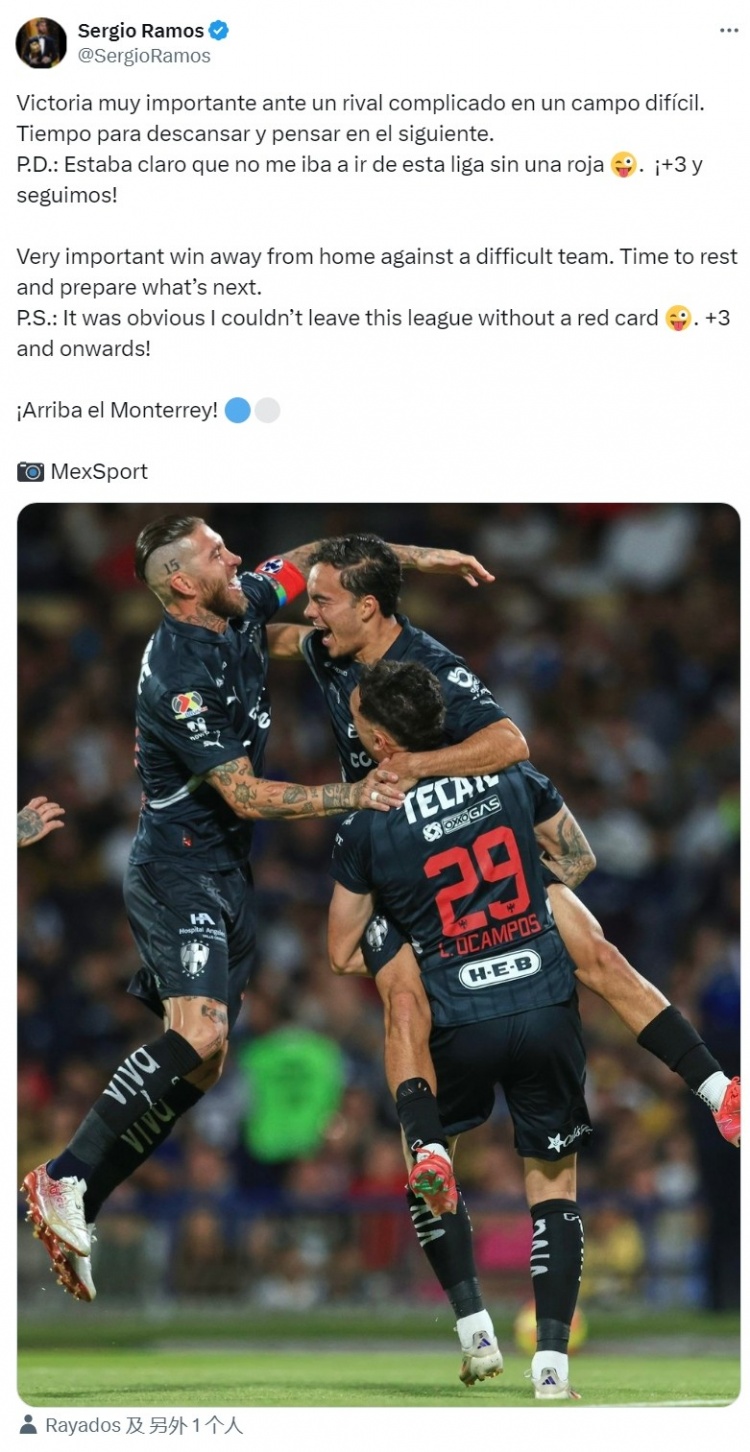 “附注——很明顯,我不能在沒吃到紅牌的情況下離開這個聯(lián)賽。全取三分,繼續(xù)前進,加油蒙特雷!”