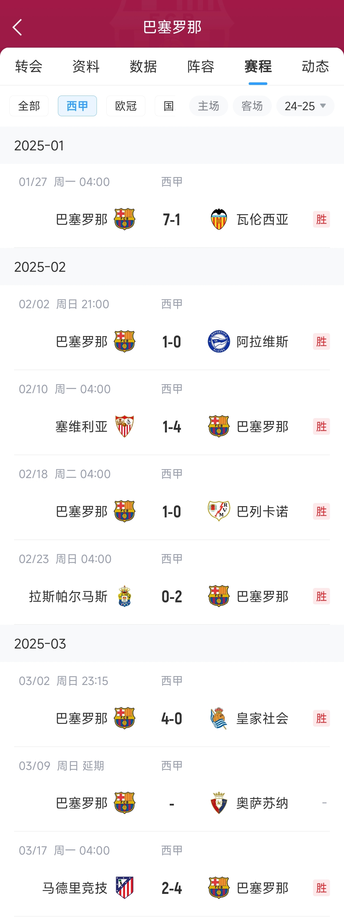 西甲第21輪-第29輪巴薩的戰(zhàn)績(jī):7輪全勝拿21分(對(duì)陣奧薩蘇納推遲)