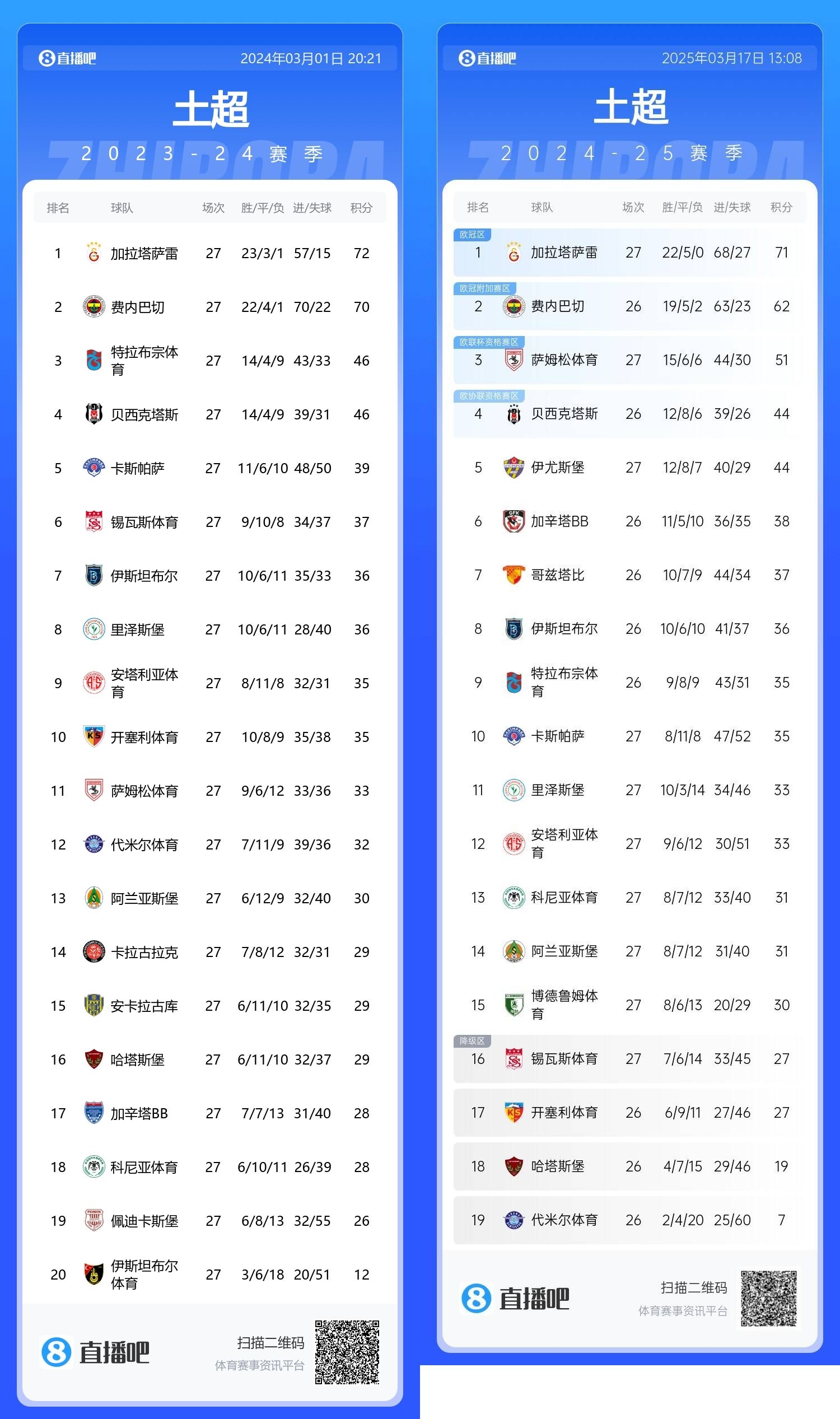 到了本賽季,加拉塔薩雷延續(xù)無敵的表現(xiàn),27場比賽后拿到71分,只比去年少1分,但費內巴切卻有一些掉隊了。盡管目前費內巴切少賽一場領先第3名也有11分之多,但落后榜首加拉塔薩雷已9分。今年費內巴切的爭冠形式并不樂觀,二人轉的局面漸漸有些偏向獨角戲了…