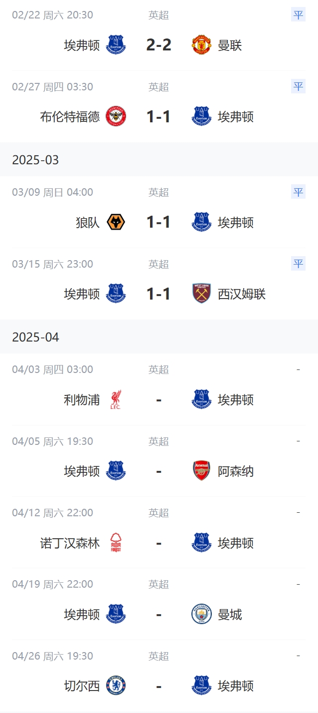 發(fā)布時間:2025年03月17日 16:50點擊:欄目:足球新聞 埃弗頓聯(lián)賽四連平,緊接著下個月就要連續(xù)交手英超前五名 除特別注明外,本站所有內(nèi)容均為九球直播整理排版,轉(zhuǎn)載請注明出處:要了親命了埃弗頓4月要輪流踢英超前5,猜猜他們能拿幾分 本文標(biāo)簽: 足球 英超 切爾西 阿森納 曼城 利物浦 埃弗頓 諾丁漢森林