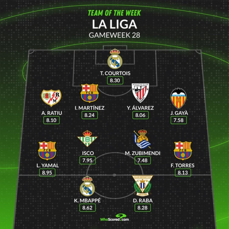 除特別注明外,本站所有內容均為九球直播整理排版,轉載請注明出處:whoscored本周西甲最佳陣:姆巴佩、亞馬爾領銜,費蘭、褲襪在列