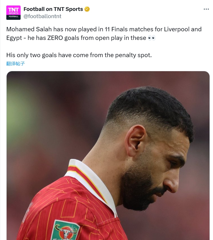 TNT Sports統(tǒng)計薩拉赫決賽數(shù)據(jù),這位前鋒在利物浦和埃及總計經(jīng)歷過11次決賽,但運動戰(zhàn)進球為0,僅僅打入兩粒點球。