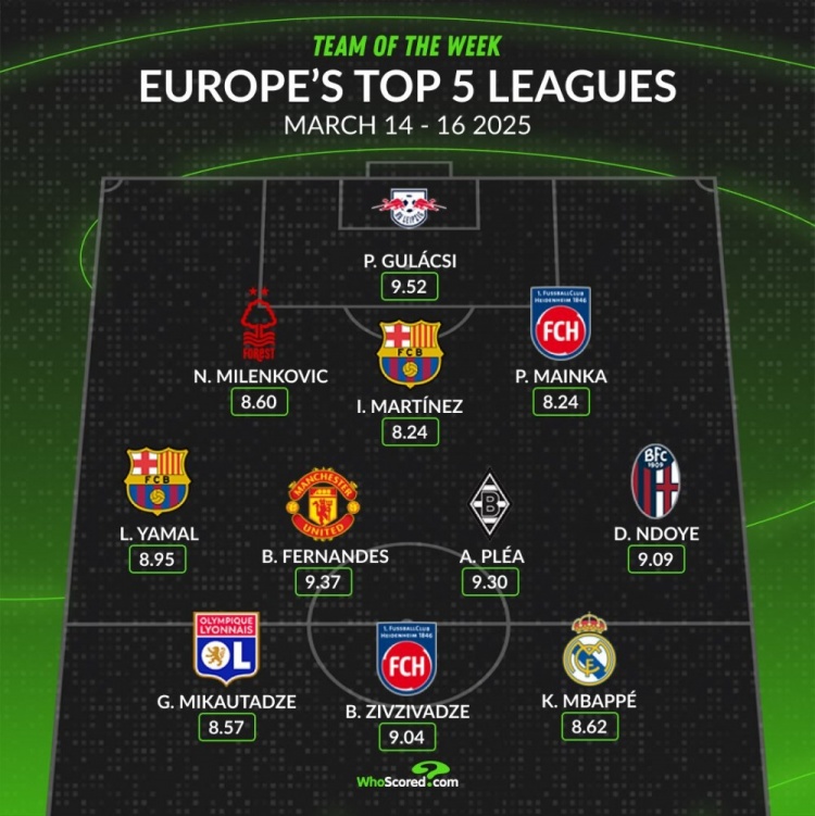 中場:亞馬爾(巴薩,8.95分)、B費(fèi)(曼聯(lián),9.37分)、普萊亞(門興,9.30分)、恩多耶(博洛尼亞,9.09分)