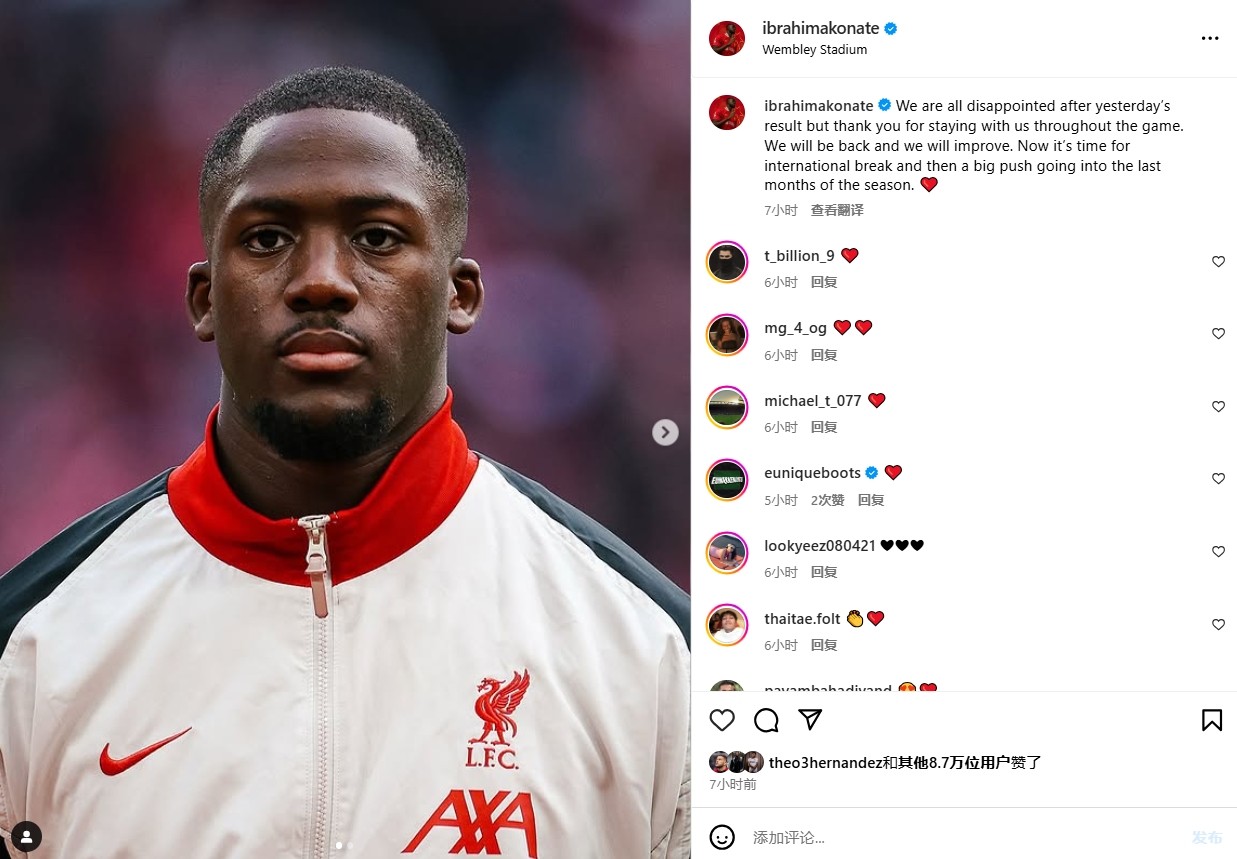 利物浦中衛(wèi)科納特在社交媒體上寫道:“昨天的比賽結(jié)果讓我們都很失望,但感謝大家整場(chǎng)比賽都與我們同在?!?/p>