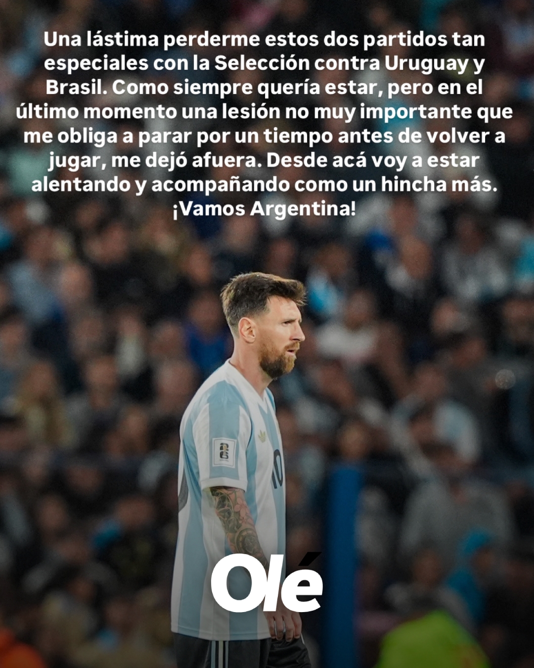 隨后,梅西在社媒上發(fā)文表示:“非常遺憾我將錯(cuò)過(guò)與烏拉圭和巴西的兩場(chǎng)比賽。盡管我始終渴望參賽,但最后一刻出現(xiàn)的輕微傷勢(shì)迫使我必須休養(yǎng)一段時(shí)間才能重返賽場(chǎng),這讓我無(wú)法參與此次賽事。在此我將作為一名普通球迷繼續(xù)為球隊(duì)加油助威。阿根廷加油!”
