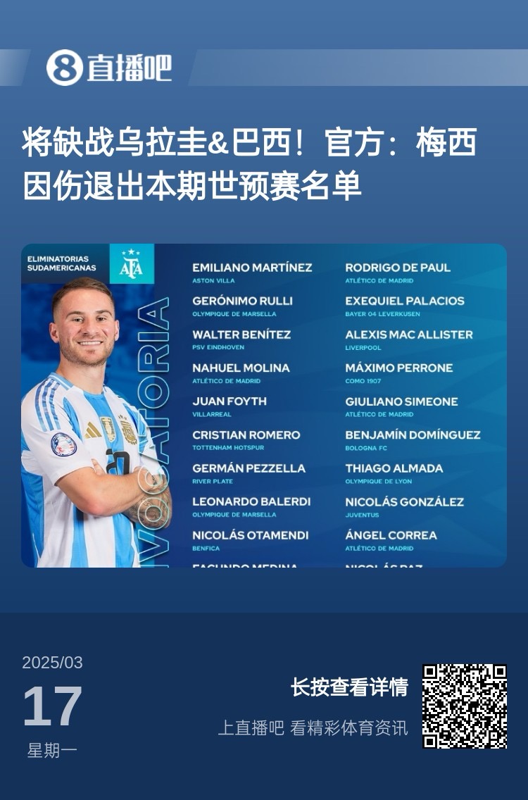 發(fā)布時間:2025年03月18日 15:50點擊:欄目:足球新聞 除特別注明外,本站所有內(nèi)容均為九球直播整理排版,轉(zhuǎn)載請注明出處:哥倆都傷了內(nèi)馬爾&梅西先后因傷退出本期國家隊 梅內(nèi)對決無了 本文標(biāo)簽: 足球 國家隊 阿根廷 巴西 邁阿密國際 梅西 內(nèi)馬爾