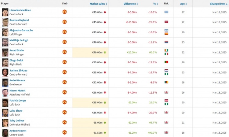 3月18日訊 德轉(zhuǎn)更新了部分英超球員身價,在此次更新中有13位曼聯(lián)球員身價發(fā)生了變化,其中9人出現(xiàn)下跌,4人出現(xiàn)上漲。