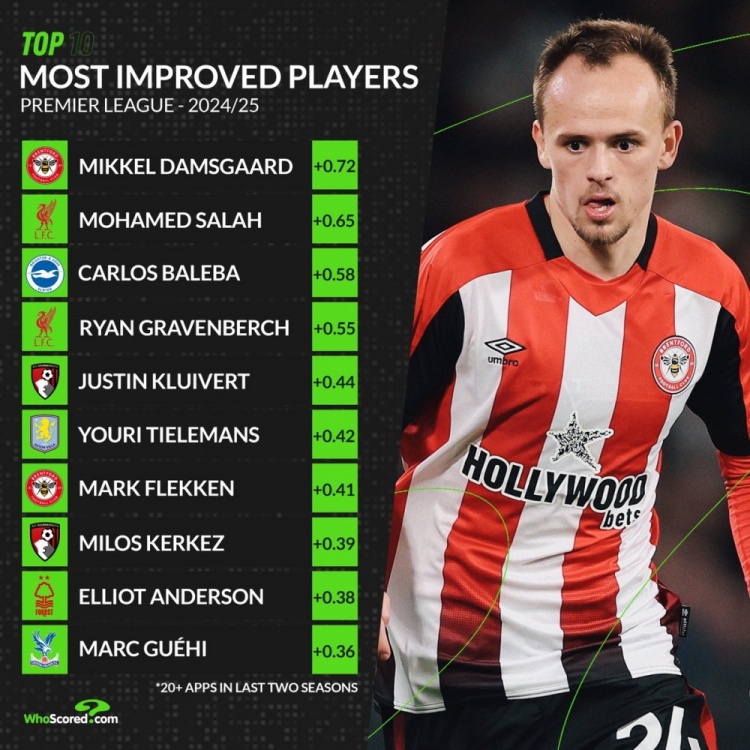 3月18日訊 whoscored統(tǒng)計(jì)了英超球員在本賽季的場(chǎng)均評(píng)分相比上賽季提升最多情況,達(dá)姆斯高力壓薩拉赫居首。