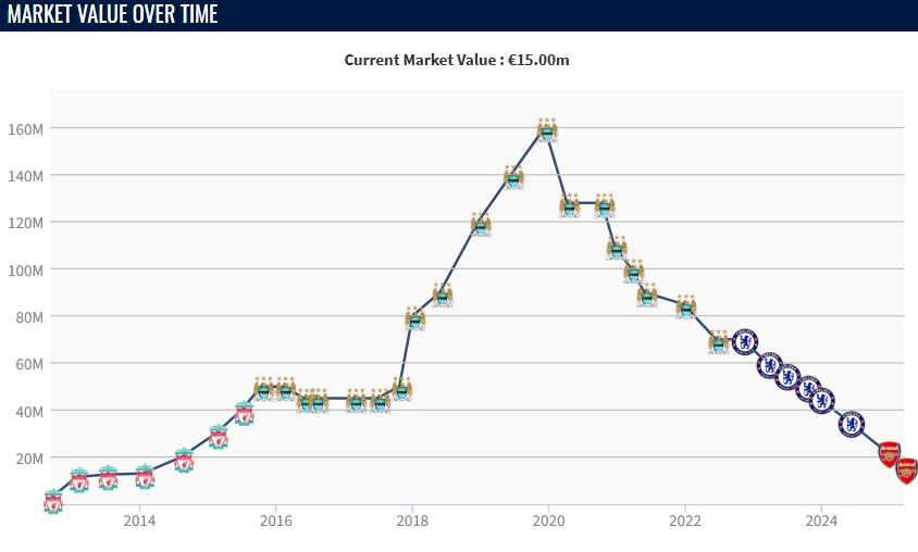 03月18日訊 今日德轉更新英超球員身價,阿森納前鋒斯特林身價再跌700萬,目前僅為1500萬歐元,不足巔峰身價十分之一。