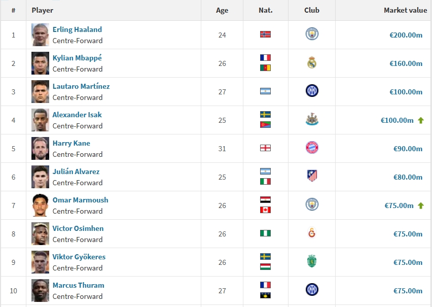 03月18日訊 德轉(zhuǎn)更新英超球員身價(jià)榜后,在最新的全球中鋒身價(jià)榜中,哈蘭德居首,姆巴佩次之,伊薩克升至第四。