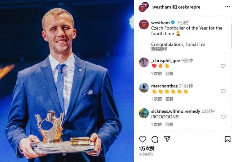 西漢姆官方賬號(hào)也轉(zhuǎn)發(fā)了該消息,并配文:“第4次當(dāng)選捷克足球先生。祝賀你,紹切克!”