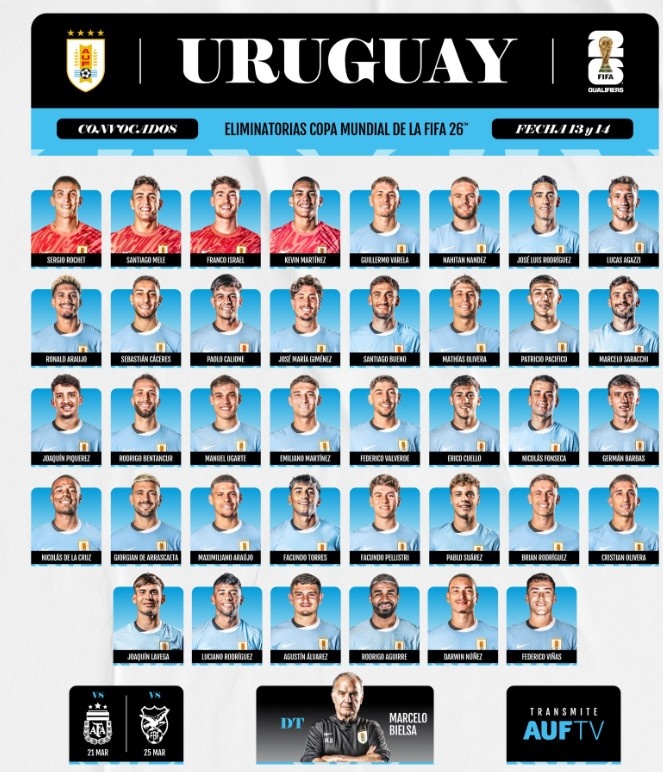 3月19日訊 為了迎接即將到來的對陣阿根廷和玻利維亞的比賽,烏拉圭國家隊公布了新一期的大名單,努涅斯、烏加特、本坦庫爾、巴爾韋德入選。