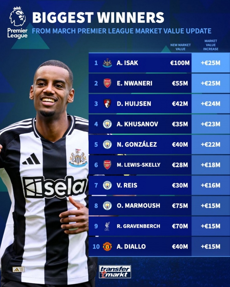 除特別注明外,本站所有內(nèi)容均為九球直播整理排版,轉(zhuǎn)載請注明出處:英超球員升值榜:伊薩克&恩瓦內(nèi)里均漲2500萬,懷森+曼城4將在列
