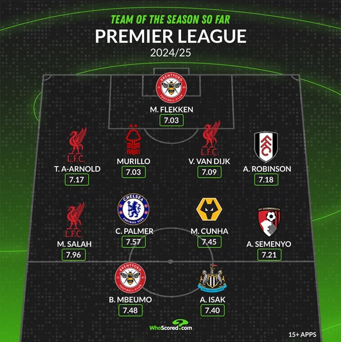 WhoScored本賽季至今英超最佳陣容(至少出場15次)