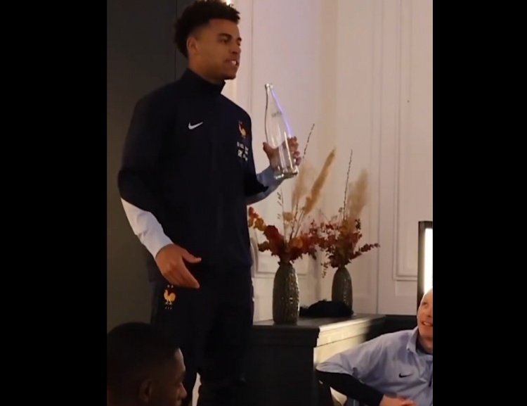 法國隊(duì)歷來有首次入選的球員需要在全隊(duì)面前唱歌的傳統(tǒng),杜埃也延續(xù)了這一傳統(tǒng),拿起玻璃瓶當(dāng)話筒,但聽起來似乎仍然有些放不開……但好在隊(duì)友們都相當(dāng)捧場,全都送上了熱烈的掌聲鼓勵(lì)。