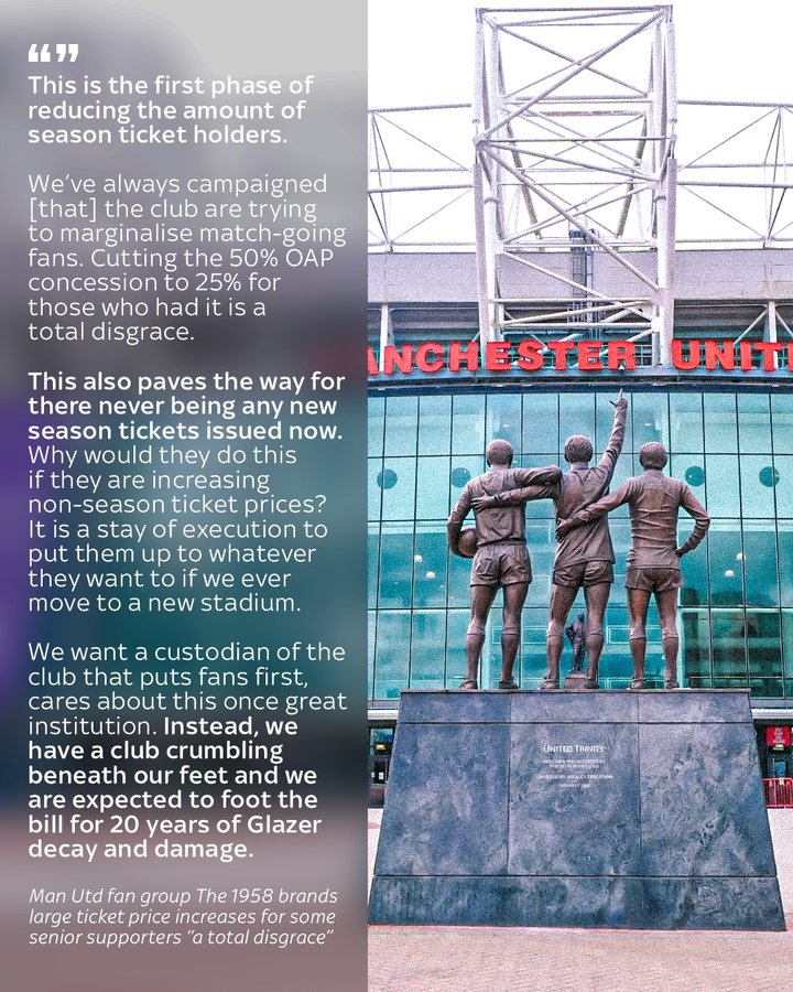 the 1958表示:“這是減少季票持有者數(shù)量的第一階段,我們一直反對(duì)俱樂部將球迷邊緣化的做法。將原有的50%的優(yōu)惠削減至25%,這完全是一種恥辱。”