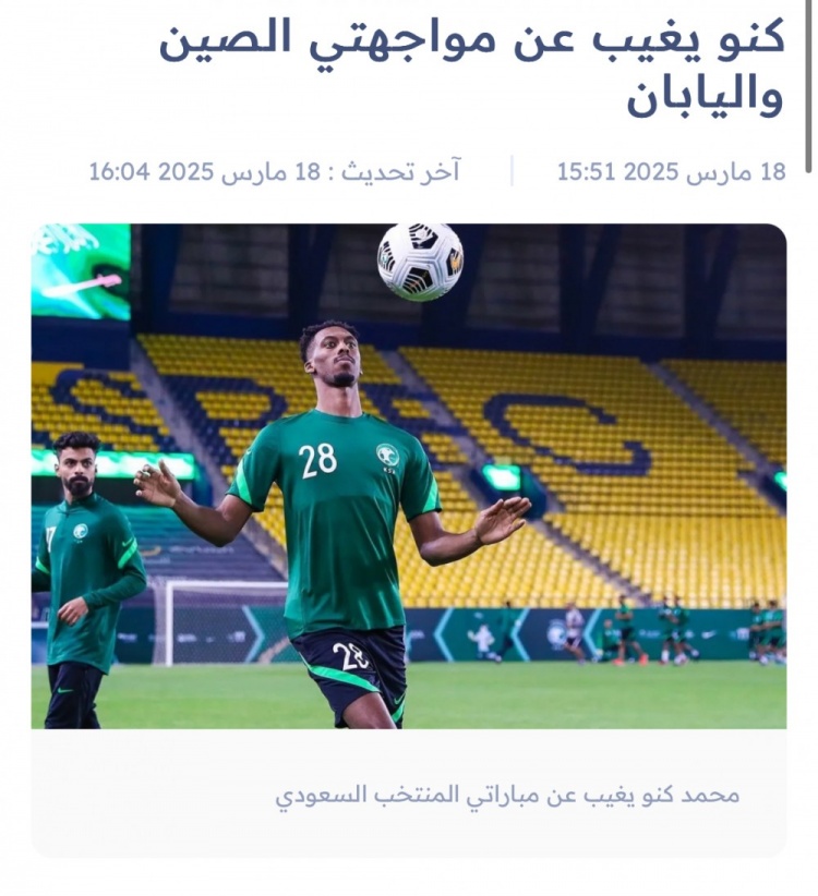 3月19日訊 據(jù)沙特媒體“akhbaar24”報(bào)道,沙特國腳中場穆罕默德-卡努將因傷缺席本月對(duì)陣中國和日本的兩場18強(qiáng)賽比賽。