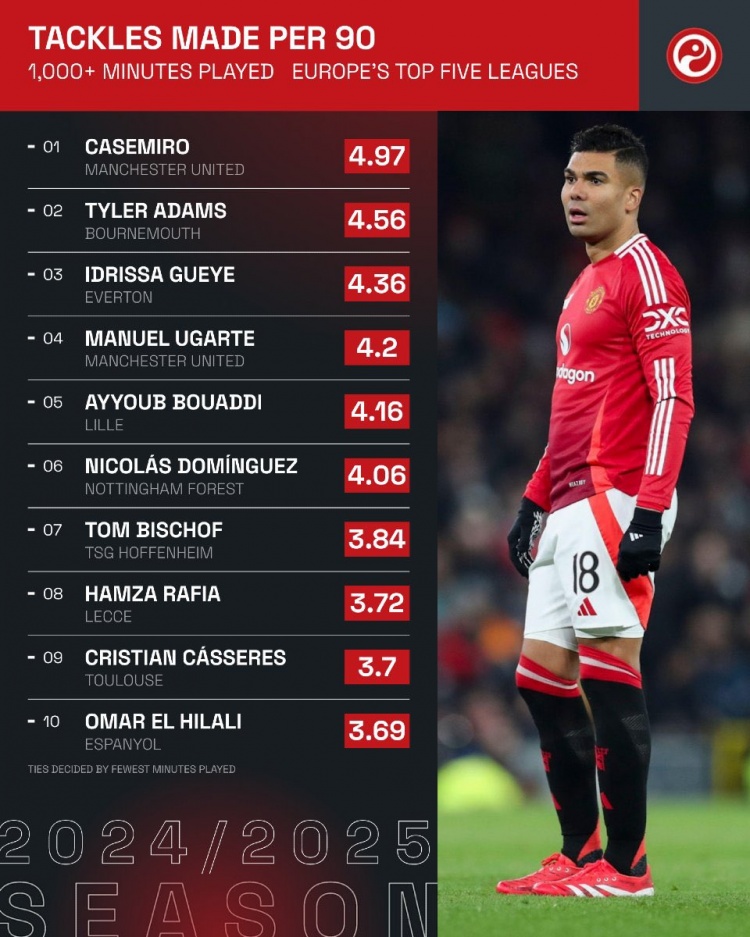 除特別注明外,本站所有內(nèi)容均為九球直播整理排版,轉(zhuǎn)載請(qǐng)注明出處:五大聯(lián)賽每90分鐘搶斷榜:卡塞米羅居首,亞當(dāng)斯、蓋耶二三位