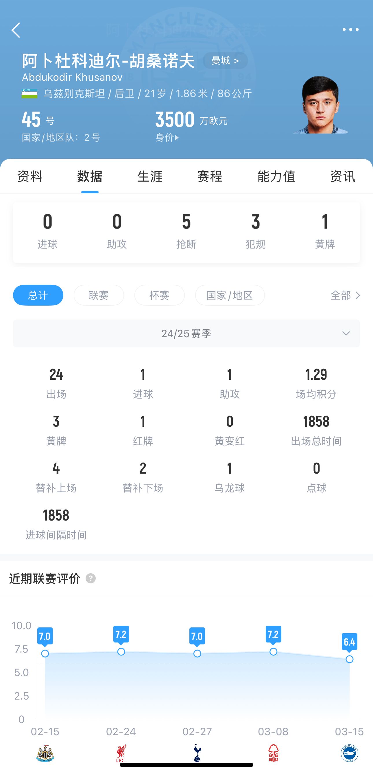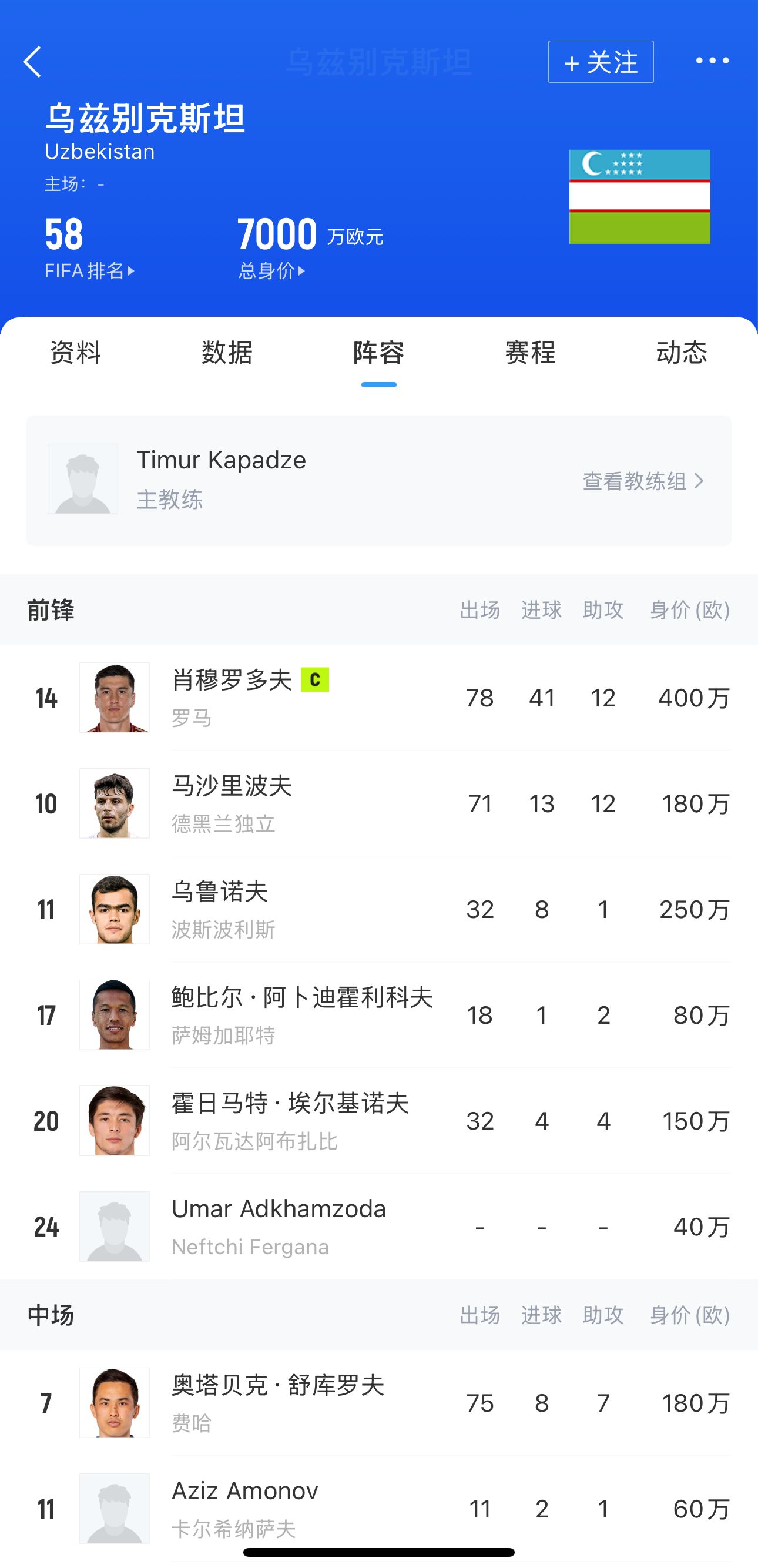 發(fā)布時(shí)間:2025年03月19日 15:50點(diǎn)擊:欄目:足球新聞 除特別注明外,本站所有內(nèi)容均為九球直播整理排版,轉(zhuǎn)載請(qǐng)注明出處:21歲小胡當(dāng)大腿烏茲別克全隊(duì)身價(jià)7000萬(wàn)歐,胡桑諾夫占一半 本文標(biāo)簽: 足球 英超 曼城 國(guó)家隊(duì) 烏茲別克斯坦
