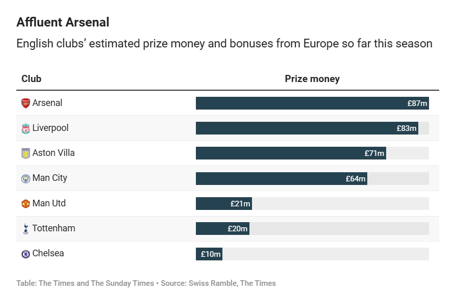 本賽季歐足聯(lián)調(diào)整了歐戰(zhàn)收入分配體系,使賽季期間的表現(xiàn)獲得更多經(jīng)濟回報而非依賴歷史成績。與上賽季相比,歐冠的總獎金池增加了20%以上,歐足聯(lián)為比賽勝利、小組賽階段積分榜排名以及晉級淘汰賽提供了比例更高的獎金。而基于俱樂部歷史表現(xiàn)計算的歐足聯(lián)系數(shù)排名所占的獎金比例減少。例如,曼城未能進入淘汰賽階段,其預計收入約為6400萬英鎊;而阿斯頓維拉晉級四分之一決賽后至少賺了7100萬英鎊。