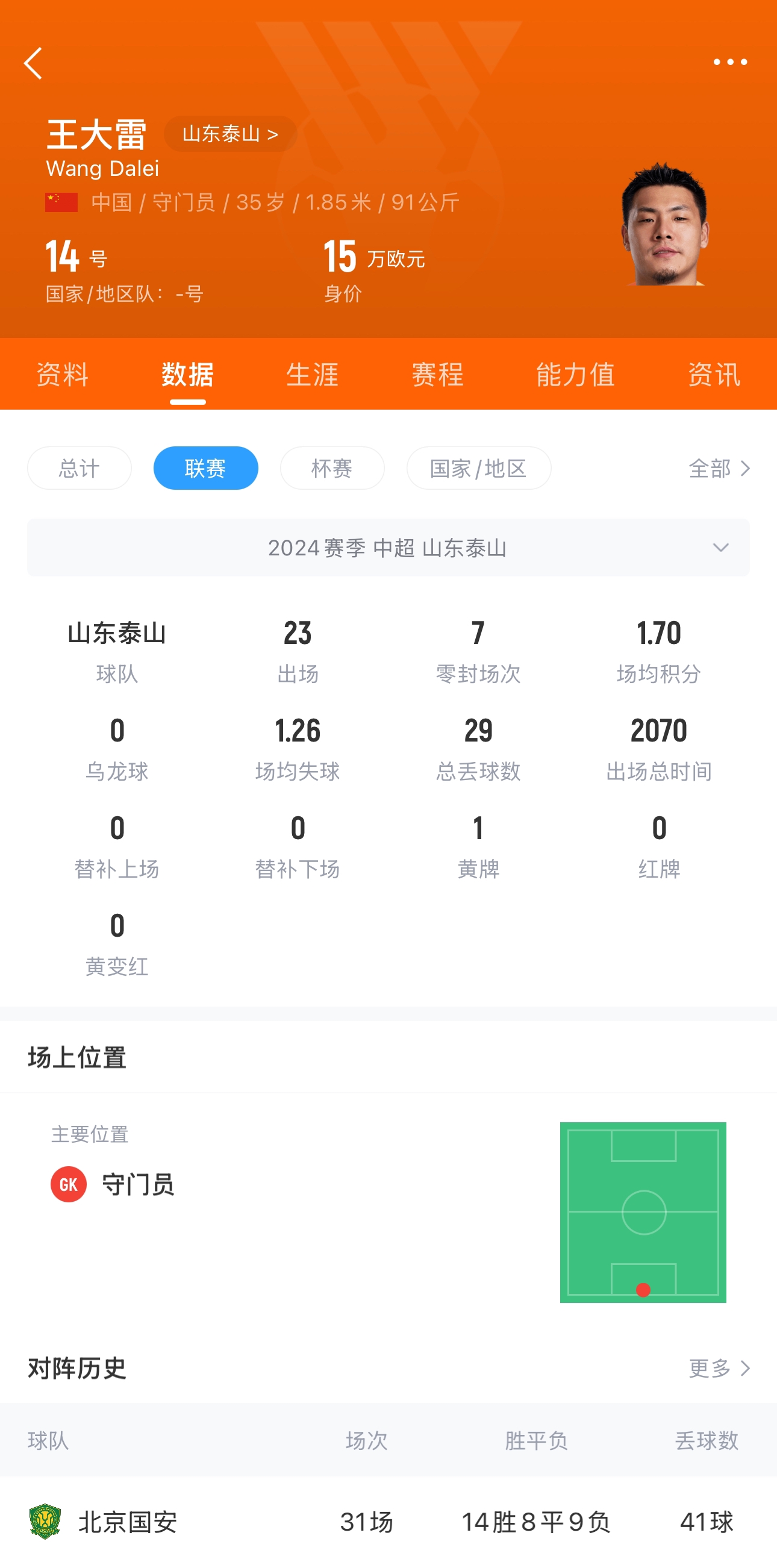 發(fā)布時間:2025年01月08日 20:50點擊:欄目:足球新聞 01月08日訊 中超聯(lián)賽年度頒獎典禮進(jìn)行,山東泰山門將王大雷榮獲2024賽季中超最佳守門員,球員也成功蟬聯(lián)該獎項。王大雷現(xiàn)年35歲,效力于山東泰山,上賽季中超總計出場23次,有7次零封,總丟球數(shù)29個。幫助山東泰山最終排在聯(lián)賽第五位。王大雷2024賽季中超詳細(xì)數(shù)據(jù)↓ 除特別注明外,本站所有內(nèi)容均為九球直播整理排版,轉(zhuǎn)載請注明出處:連續(xù)兩年當(dāng)選官方:王大雷榮膺2024賽季中超最佳守門員 本文標(biāo)簽: 足球 國家隊 中國男足 中國足球 中超 山東泰山