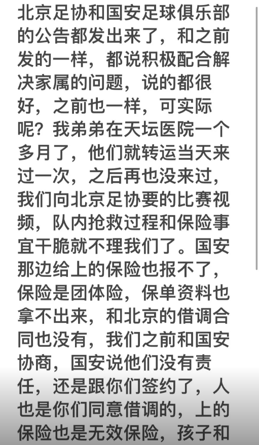 北京足協(xié)和國(guó)安足球俱樂部的公告都發(fā)出來了,和之前發(fā)的一樣,都說積極配合解決家屬的問題,說的都很好,之前也一樣,可實(shí)際呢?我弟弟在天壇醫(yī)院一個(gè)多月了,他們就轉(zhuǎn)運(yùn)當(dāng)天來過一次,之后再也沒來過,我們向北京足協(xié)要的比賽視頻,隊(duì)內(nèi)搶救過程和保險(xiǎn)事宜干脆就不理我們了。