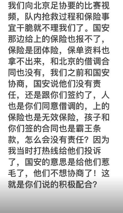 國(guó)安那邊給上的保險(xiǎn)也報(bào)不了,保險(xiǎn)是團(tuán)體險(xiǎn),保單資料也拿不出來,和北京的借調(diào)合同也沒有,我們之前和國(guó)安協(xié)商,國(guó)安說他們沒有責(zé)任,還是跟你們簽約了,人也是你們同意借調(diào)的,上的保險(xiǎn)也是無效保險(xiǎn),孩子和我們向北京足協(xié)要的比賽視頻,隊(duì)內(nèi)搶救過程和保險(xiǎn)事宜干脆就不理我們了。國(guó)安那邊給上的保險(xiǎn)也報(bào)不了,保險(xiǎn)是團(tuán)體險(xiǎn),保單資料也拿不出來,和北京的借調(diào)合同也沒有,我們之前和國(guó)安協(xié)商,國(guó)安說他們沒有責(zé)任,還是跟你們簽約了,人也是你們同意借調(diào)的,上的保險(xiǎn)也是無效保險(xiǎn),孩子和你們簽的合同也是霸王條款,怎么會(huì)沒有責(zé)任?因?yàn)槲耶?dāng)時(shí)打熱線給他們投訴了,國(guó)安的意思是給他們?nèi)敲耍麄儾幌雲(yún)f(xié)商了!這就是你們說的積極配合?