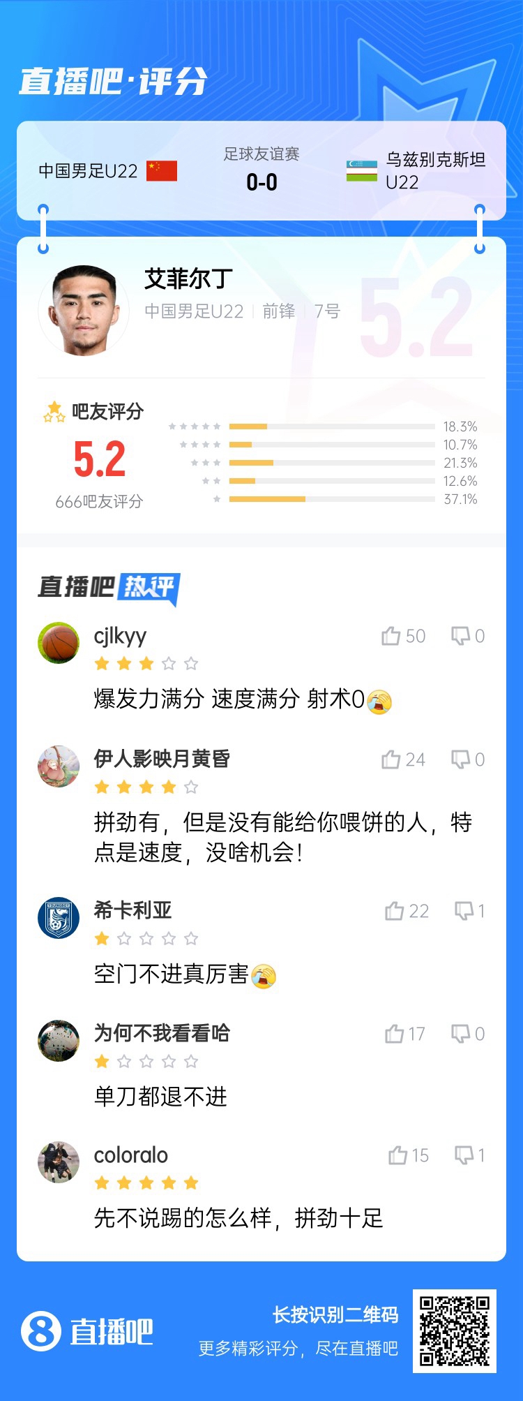 發(fā)布時間:2025年03月20日 22:50點擊:欄目:足球新聞 03月20日訊 鹽城國際足球邀請賽,U22國足0-0戰(zhàn)平烏茲別克斯坦U22,本場比賽入選U22國足的海港前鋒艾菲爾丁,替補出戰(zhàn)31分鐘,第90分鐘接蒯紀(jì)聞直塞獲得絕佳單刀絕殺機會,但可惜艾菲爾丁的單刀打偏。賽后吧友給艾菲爾丁打出5.2的評分↓ 除特別注明外,本站所有內(nèi)容均為九球直播整理排版,轉(zhuǎn)載請注明出處:單刀打偏艾菲爾丁賽后僅收獲5.2分:爆發(fā)力&速度滿分 射術(shù)0分 本文標(biāo)簽: 足球 國家隊 中國足球 中超