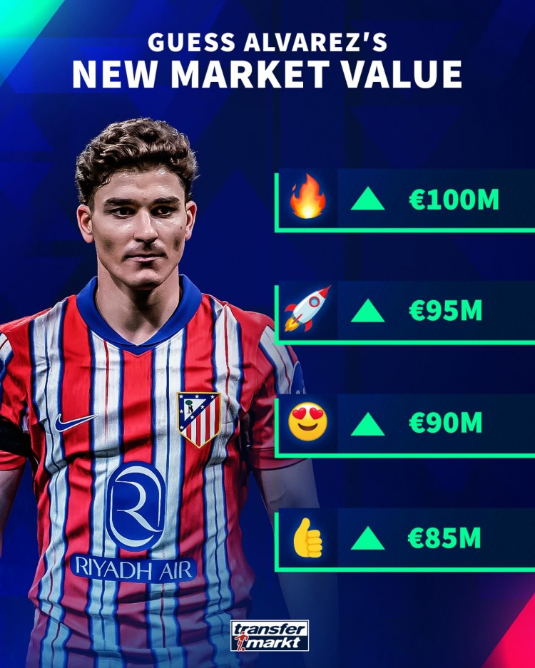 目前,小蜘蛛的身價估值為8000萬歐。根據(jù)德轉的圖片,阿爾瓦雷斯的身價確定將會上漲,可能漲到1億歐、9500萬歐、9000萬歐或者8500萬歐。