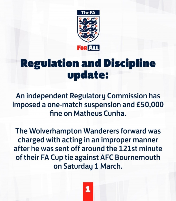 今天,英足總公布了對庫尼亞的罰單。英足總表示:“獨(dú)立調(diào)查委員會(huì)決定對庫尼亞追加禁賽一場、罰款5萬英鎊。在對陣伯恩茅斯的足總杯比賽中,這名狼隊(duì)前鋒在第121分鐘被罰下時(shí)出現(xiàn)不當(dāng)行為。隨后,這名球員承認(rèn)了指控。在4月13日星期日前,庫尼亞禁止參與英格蘭國內(nèi)足球賽事。”
