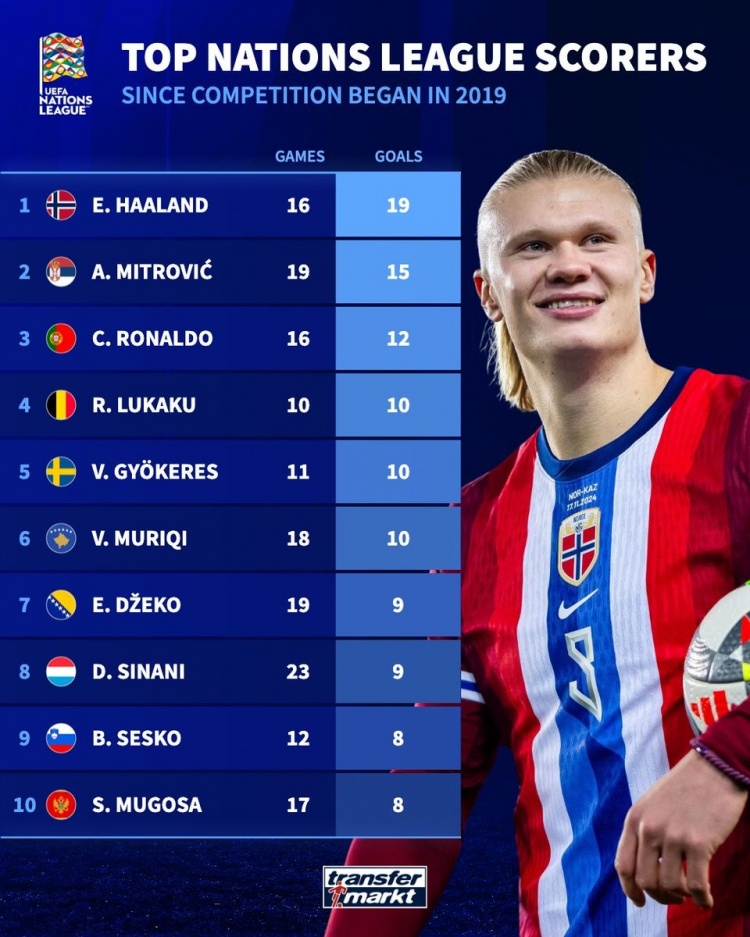 3月21日訊 歐國聯(lián)賽事戰(zhàn)火重燃,《轉(zhuǎn)會市場》也統(tǒng)計了歐國聯(lián)歷史射手榜,哈蘭德居首。