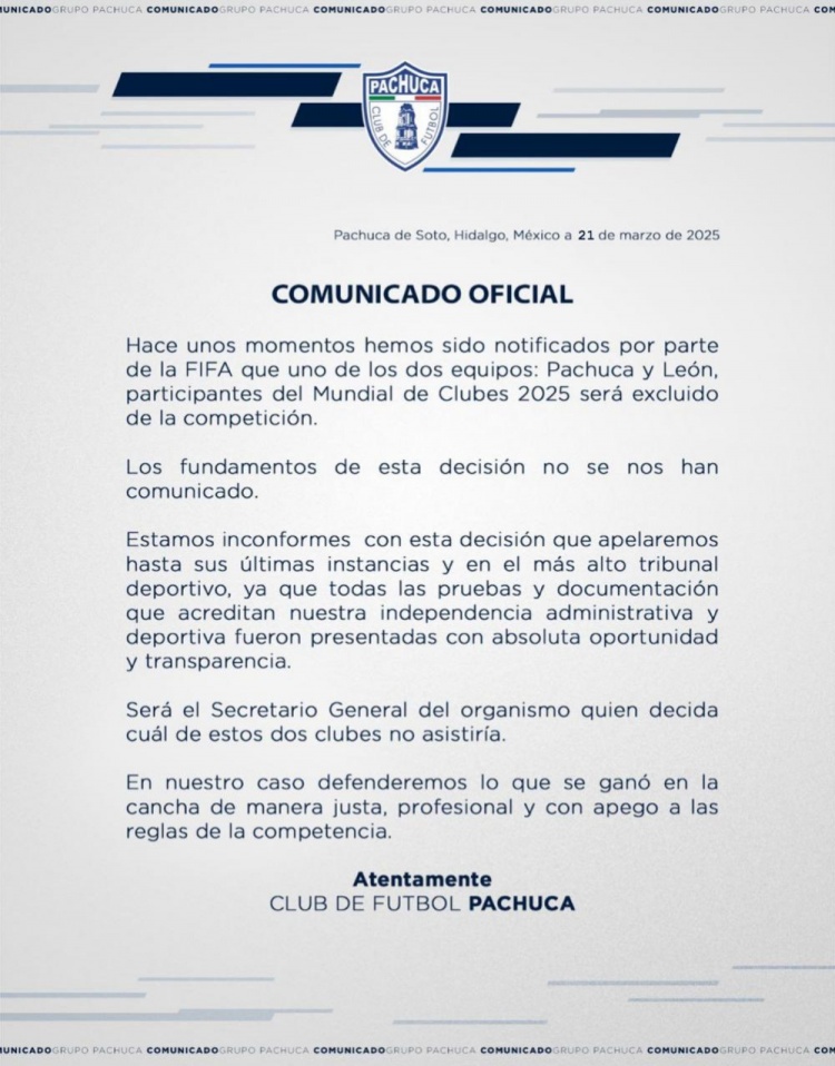 帕丘卡表示,國際足聯(lián)已通知兩支墨西哥球隊(duì)(帕丘卡和萊昂)中的一支將被排除在2025年世俱杯之外,但未向俱樂部說明具體理由。對此決定,帕丘卡俱樂部表示不滿,并計(jì)劃上訴至最高體育法庭。