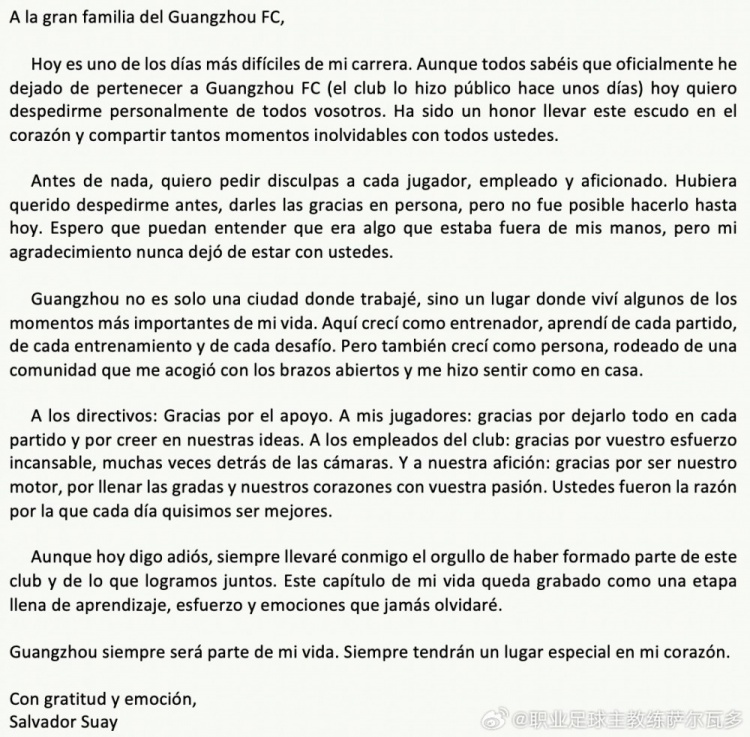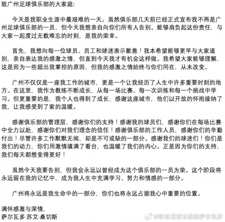 1月1日訊 今日,現(xiàn)重慶銅梁龍主帥、前廣州隊主帥薩爾瓦多在社媒用中西雙語發(fā)文,向廣州隊致謝并告別。薩爾瓦多的告別信寫道: