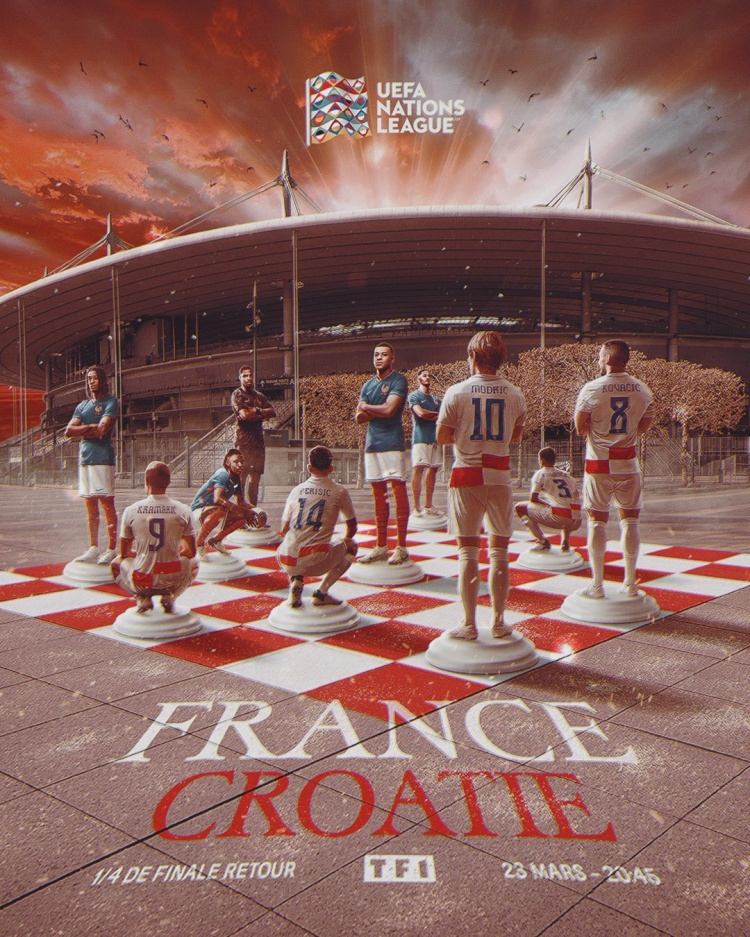 法國隊官方社媒發(fā)布了為次回合制作的海報,內(nèi)容為兩隊球員在球場外的棋盤上對峙,姆巴佩、莫德里奇領(lǐng)銜出鏡。