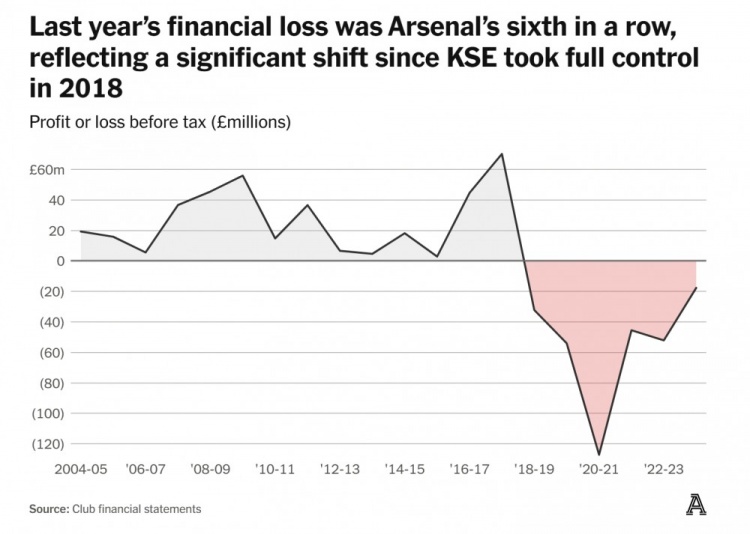 在2018年之后,阿森納連續(xù)六年出現(xiàn)財務(wù)虧損,也體現(xiàn)了阿森納財務(wù)所有權(quán)重大轉(zhuǎn)變后的影響