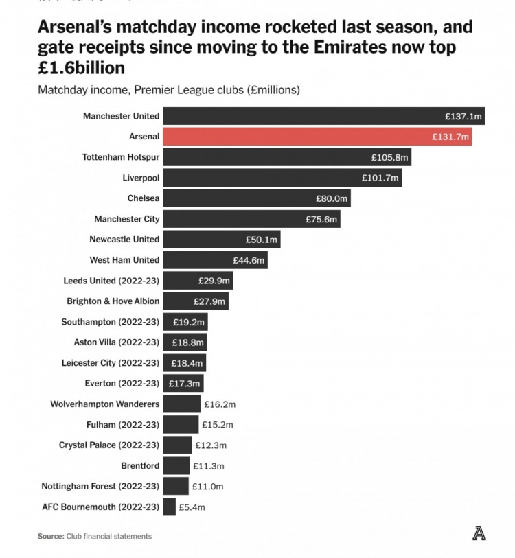 所以,那個賽季阿森納拿下了單賽季隊史最高門票收入,國內(nèi)比賽日收入躍升聯(lián)賽第二位。去年阿森納的比賽日收入僅比曼聯(lián)少了550萬英鎊,這也意味著兩隊之間的差距明顯縮?。捍饲皟蓚€賽季,兩隊的比賽日收入都相差超過3000萬英鎊。盡管酋長球場的建設(shè)成本,可能在過去幾年里限制了球隊的發(fā)展,但如今搬遷的好處正在越來越明顯。