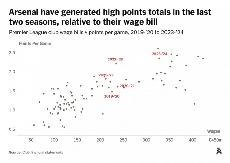 阿森納的高薪資,也助力他們拿到了更高的聯(lián)賽積分