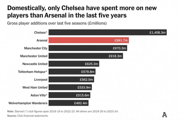 過去五年,只有切爾西在轉(zhuǎn)會市場上的投入超過阿森納