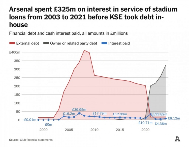 2003年到2021年,KSE內(nèi)部承擔(dān)債務(wù)之前,阿森納在球場貸款利息上花費了3.25億英鎊