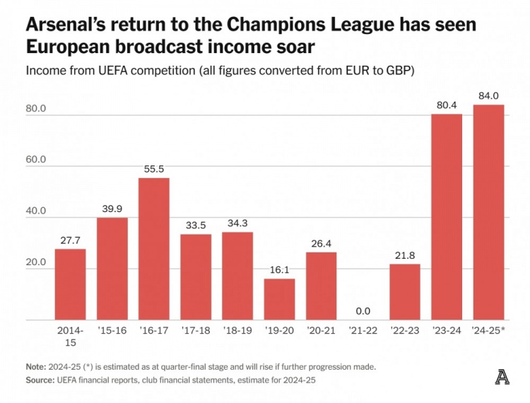重返歐冠聯(lián)賽之后,阿森納在歐戰(zhàn)賽事中獲取的轉(zhuǎn)播收入飆升