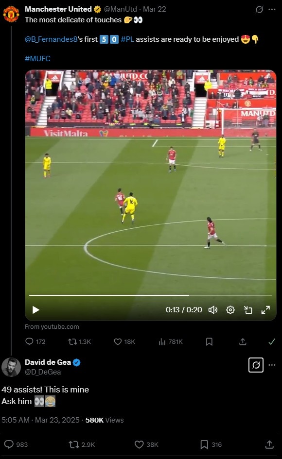 3月23日訊 曼聯(lián)官推日前曬出了隊(duì)長布魯諾-費(fèi)爾南德斯英超50個(gè)助攻的集錦,但德赫亞調(diào)侃表示有一個(gè)助攻應(yīng)該算在自己頭上。