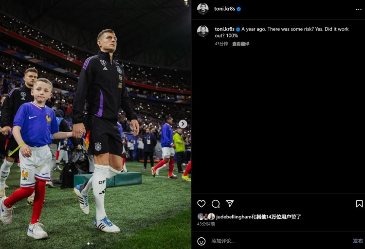 克羅斯曬出比賽照片,并寫道:“一年前。有風險嗎?是的。我成功了嗎?100%?!?/p>