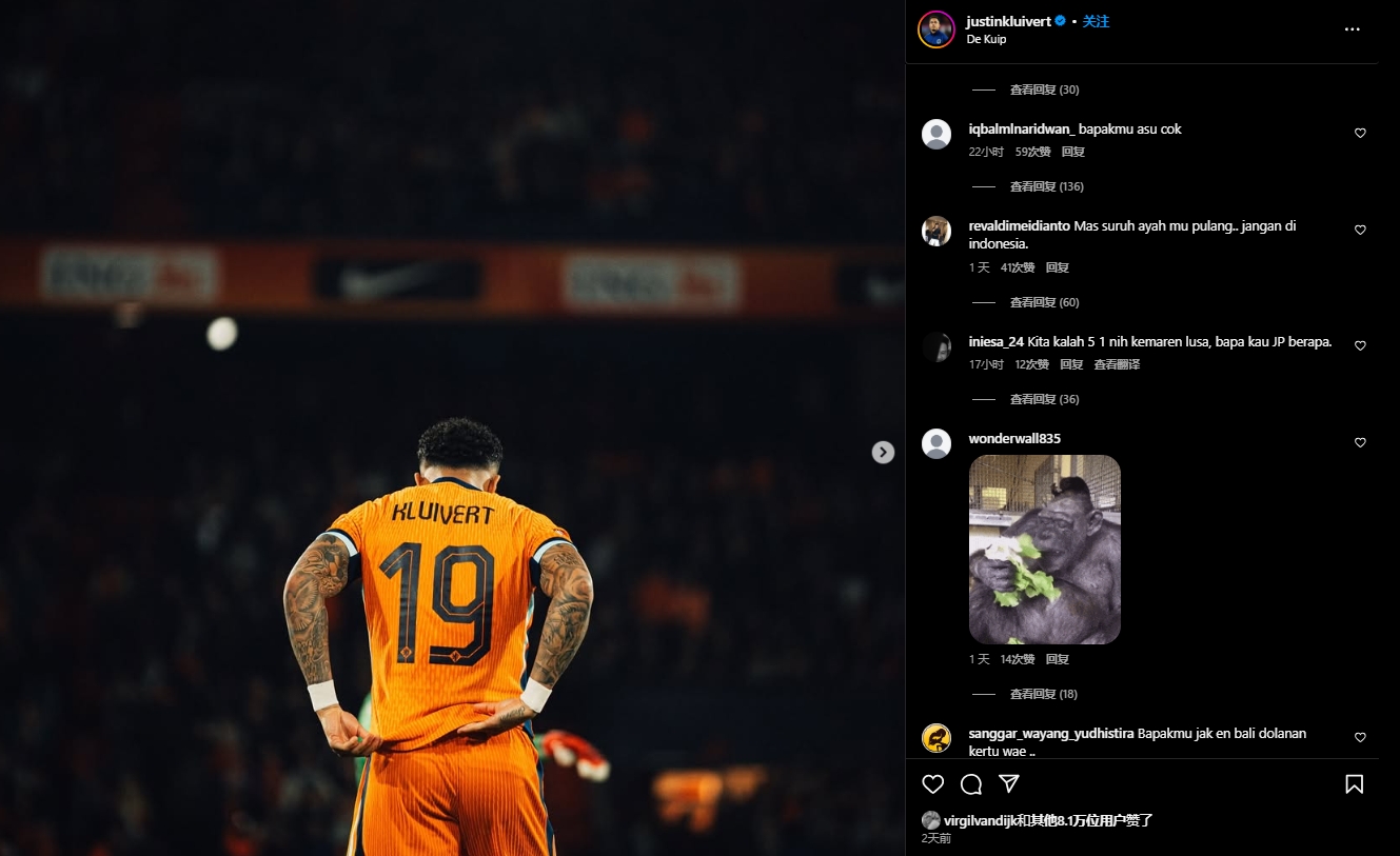 小克魯伊維特在兩天前發(fā)布了有關(guān)自己代表荷蘭國家隊上場的社媒,但印尼球迷在這條社媒下留言,其中有很多帶有攻擊性的言論。
