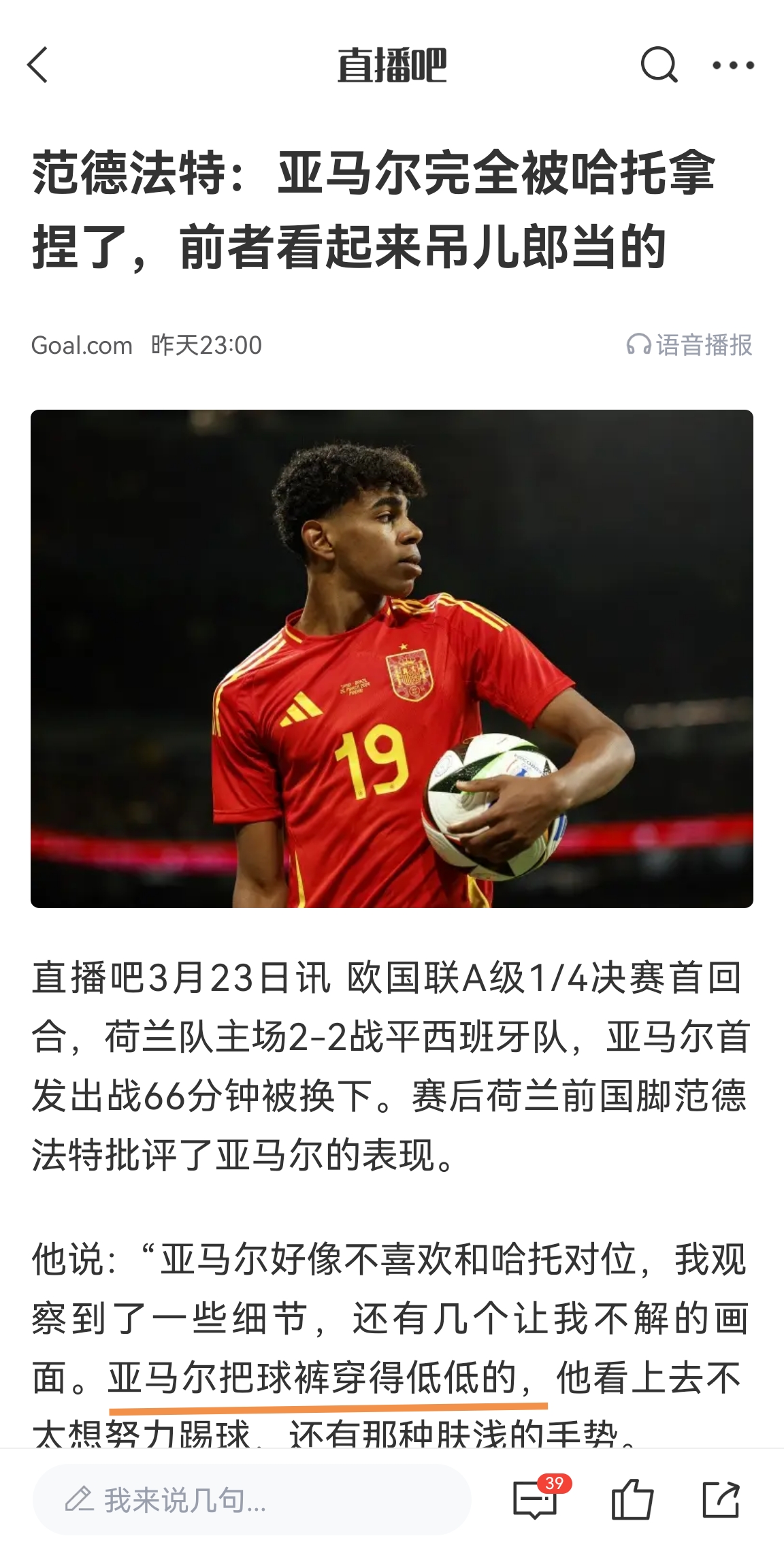 亞馬爾的這一動(dòng)作顯然是有意為之。就在這場(chǎng)比賽前,荷蘭名宿范德法特批評(píng)了亞馬爾在首回合的表現(xiàn),甚至認(rèn)為亞馬爾“亞馬爾把球褲穿得低低的,他看上去不太想努力踢球,還有那種膚淺的手勢(shì)”。