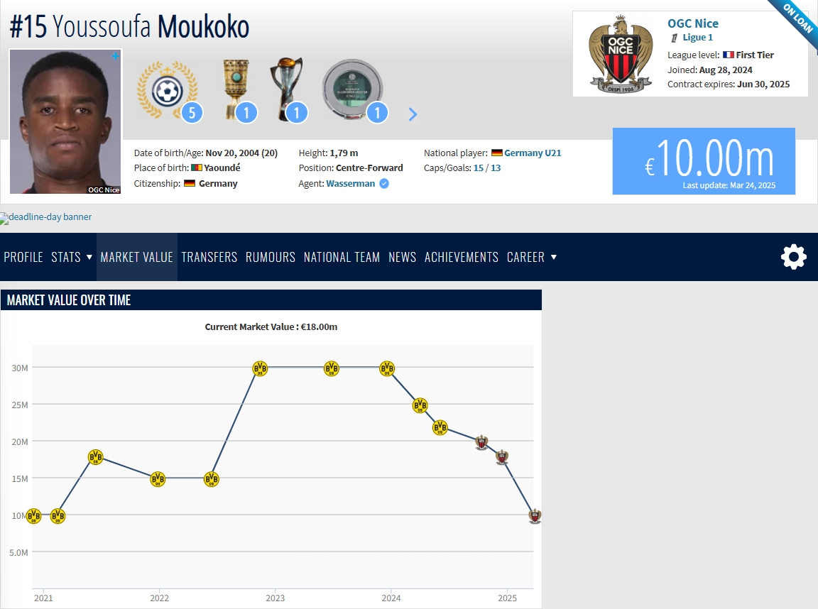 穆科科生涯至今的最高身價(jià)出現(xiàn)在他“17-19歲”時(shí),當(dāng)時(shí)年少成名的他在多特被寄予厚望,德轉(zhuǎn)身價(jià)為3000萬歐。
