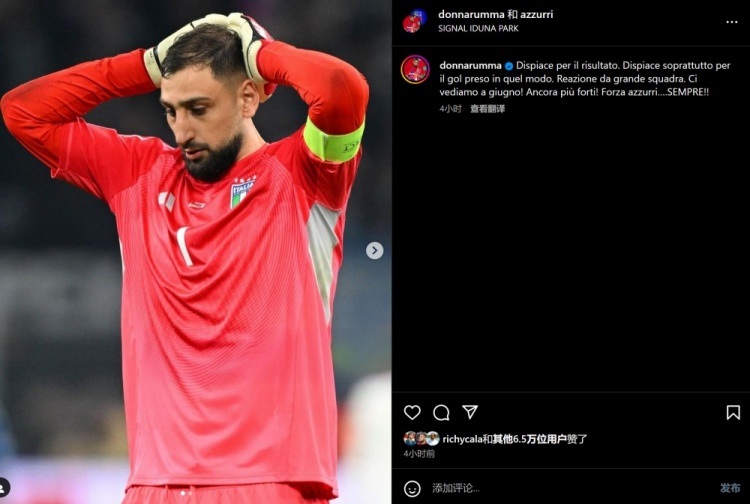 3月24日訊 歐國聯(lián)1/4決賽次回合,意大利3-3戰(zhàn)平德國,總比分4-5被淘汰。賽后,多納魯馬更新了社媒,就結果道歉,并鼓舞了士氣。