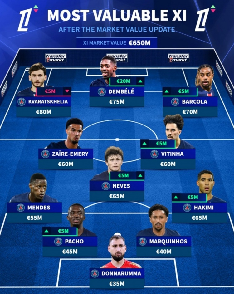 3月25日訊 德國(guó)轉(zhuǎn)會(huì)市場(chǎng)更新了法甲球員的身價(jià)估值,并列出了目前法甲身價(jià)最高的陣容,該陣容由巴黎球員包攬。