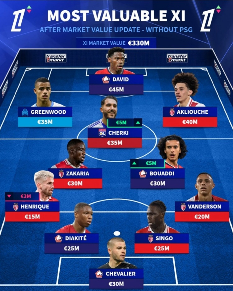不含巴黎球員的法甲身價(jià)最高陣容↓